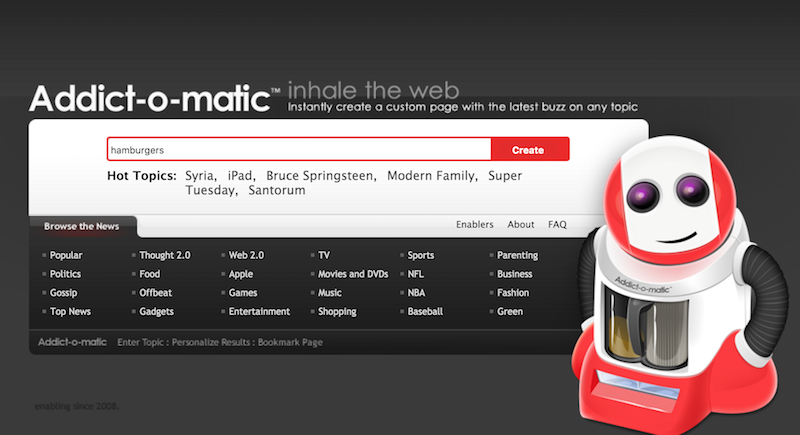 “Inhale the web” with the friendly looking hoover guy by creating your own topic page, which you can bookmark and see results from a huge number of channels in that one page (including Google, Bing News, Twitter, YouTube, Flickr).