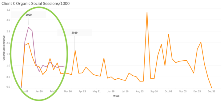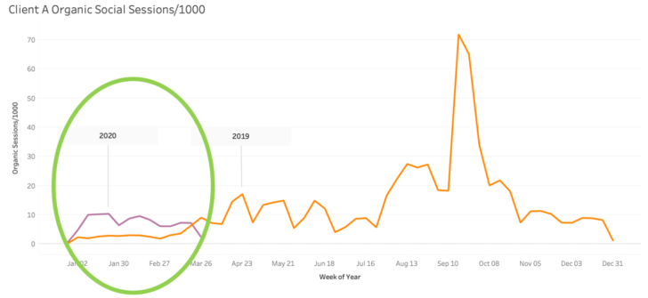 Notice that 2020 and 2019 organic social traffic is pretty close together until the 2nd and 3rd week of March when we start to see some distance where 2020 rises and maintains above 2019. It raises the floor and gets a larger return for the investment.