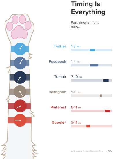 Each platform has its peak periods where your target audience is the most active on those platforms? That time is the best time to make posts, comment, and even schedule your ads. Being active during the times when your audience is the least active will kill your content marketing effort and it will be a complete waste of time. The infographic below will guide you when those peak periods are.