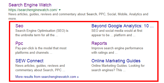As I hinted at in the introduction just now, sitelinks are additional links which appear beneath the main URL for a brand or publisher when you search for it on Google. They deep link to other pages within your site, and are designed by Google to “help users navigate your site”.