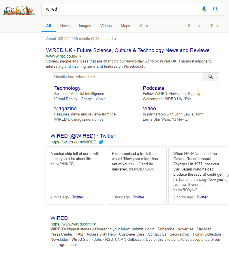 For example, if I search for Wired magazine from the UK, the UK publication – wired.co.uk – is the one that ranks top for its brand name and gets sitelinks, while its US site, wired.com, ranks lower down.