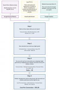 Once you’ve done your keyword research, calculate the average CPC. Then look at your desired cost per conversion. From this you can calculate the conversion rate required. Below is a conversion benchmark for most brochure websites: