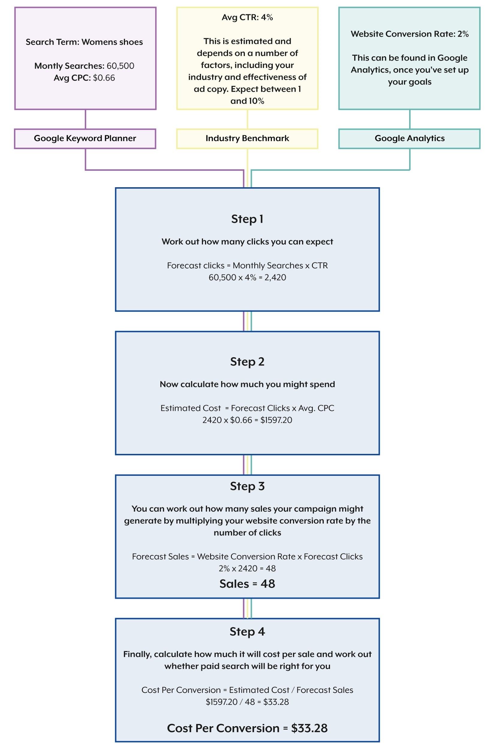 Simply divide your target cost per conversion by your expected CPC to work it out. Many advertisers set out on paid search campaigns without doing this calculation and learn that a campaign is not viable the expensive way.