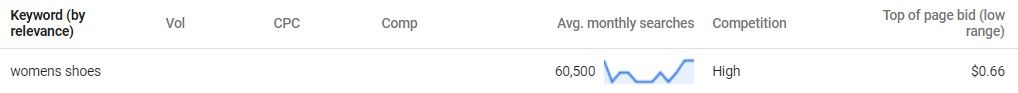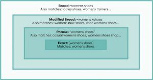 - Broad match – where keywords are represented like this: womens shoes. This keyword would trigger your ads if a user searched for this phrase in any order, and with synonyms too (e.g. ‘cheap womens shoes’, ‘womens blue shoes’ or ‘ladies shoes’)