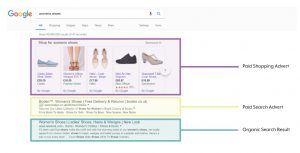 Ad formats include text ads, which are shown at the top or bottom of the organic search results, or shopping ads shown above the search results.