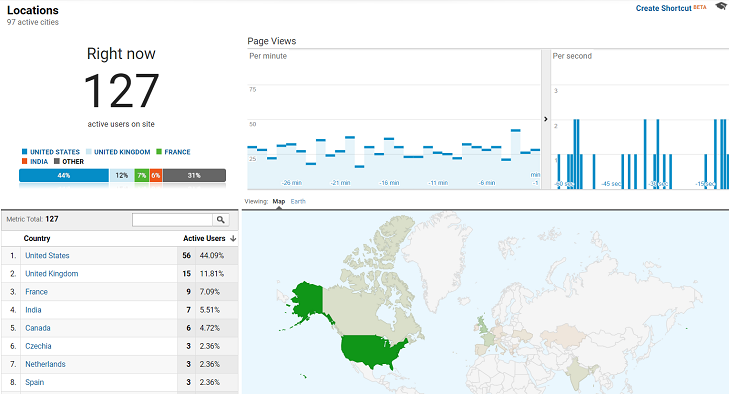 Real-time location data can be useful if you’re running a campaign targeted at a specific region of the world and want to monitor its performance, or if you want to get a sense of where your users are accessing your website from at different times of day.