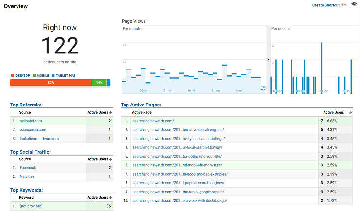 This is the big-picture view of what’s happening on your website at any given moment. The Real-Time Overview report shows how many users are currently active on your site, a list of the top active pages, top sources of referral traffic, top social traffic sources, the top locations that users are visiting from, and more.