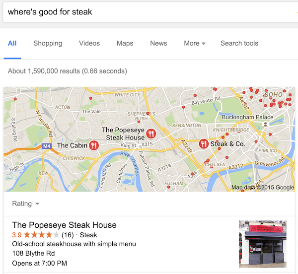 Search engines try to provide the most relevant results to a searcher’s query, whether it’s a simple answer to the question “how old is Ryan Gosling?” (the answer of which Google will likely provide without you having to leave the SERP) to more complicated queries such as “what is the best steak restaurant nearest to me?”