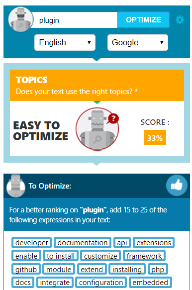 The tool shows you topics you should develop as well as those you’d better eliminate for search robots to understand the text is relevant to the specific queries. The plugin also suggests you a list of words you could add to improve your content. The best thing is that you don’t need great SEO expertise to use it.