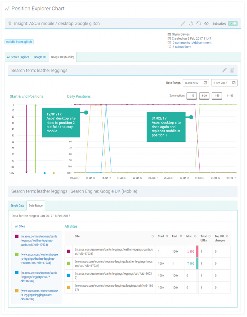 Pi Datametrics tracked the ranking of the affected sites on both mobile and desktop with its data-driven SEO platform, in order to try and determine what might be causing the change. Glynn Davies explained Pi’s thinking in trying to determine the cause: