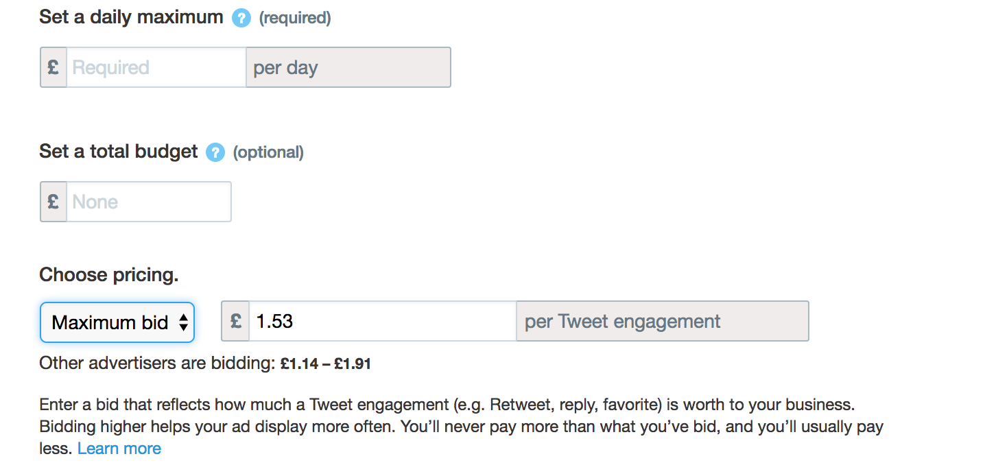 Twitter allows you to set a daily budget, along with a total budget for the campaign as a whole, to make sure that you don’t go over-budget by accident.