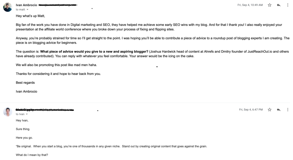 I don’t have a template to help you get started, but below I have provided a screenshot of an email I sent out to one of the experts that we included in our roundup. Feel free to use it for some inspiration and to help garner some ideas.