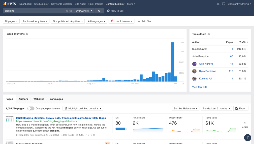 Ahrefs, BuzzSumo, and Hootsuite are other awesome tools to research hot topics and authoritative blogs, as they display real-time data on their referring industries, traffic value, and the number of shares they get for their posts.