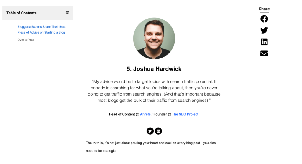 Ultimately, the success of such a compilation is given by the shares, referrals, and traffic you get from your audience. Create a fantastic expert roundup post by asking a question your readers are interested in, and your contributors can easily answer.