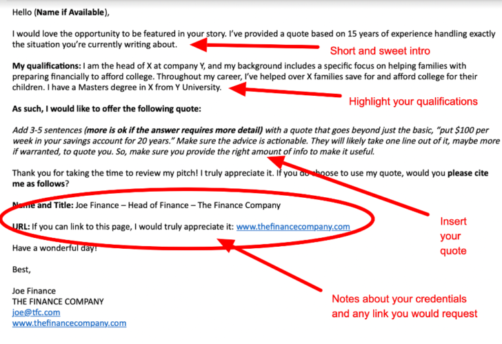 By using this format, you’ll have a better chance of getting accepted, and when you get accepted, the writer will typically add a link back to your site from your quote.
