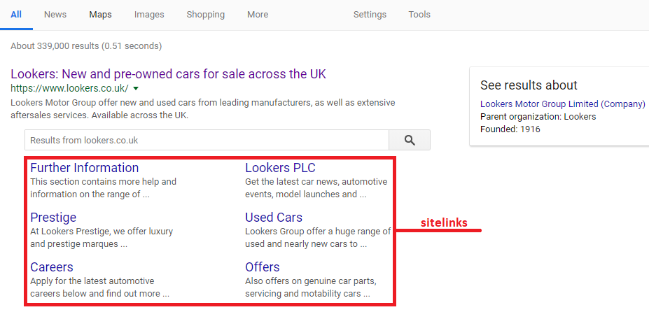 Not only will a good site structure make your site more accessible to readers, while at the same time making it easy for the search engines to crawl your website, but you are also likely to be rewarded by sitelinks. Here’s what a Google search for Lookers turned up: