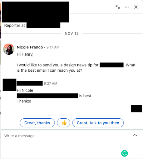 One of the most important things to note when reaching out on social media is making sure the content you’re pitching is relevant. This connection worked because the marketer did their research and took the writer’s beat into consideration and referenced a recent article they had covered in the pitch email.