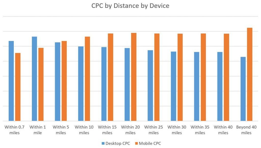 The trend here is the opposite based on device. CPCs are going up for mobile each distance further from the location vs. desktop which is seeing a steady decrease the further away. I think the desktop reduction speaks to the geo-targeting that occurs and reduces competition since fewer brands would enter the auction.