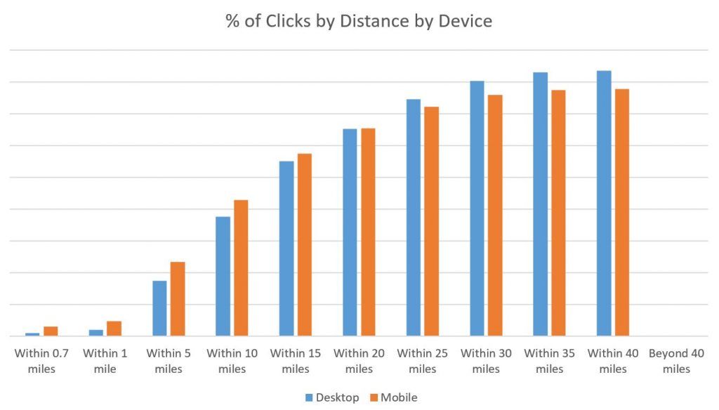 Although cumulative, the amount of traffic that Google is able to gather less than one mile from a physical location is still much smaller than the traffic more than 15 miles away. So it make sense that there is still a larger percentage for mobile devices versus desktop at a close range, given the relevancy factor for those consumers as well as the advertisers themselves.