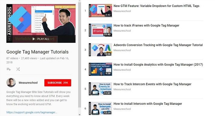 Measureschool’s channel is another good resource for learning about Google Tag Manager on YouTube. There’s a lot of content here, directed towards a wide range of skill levels – beginners as well as advanced users will be able to find something helpful.