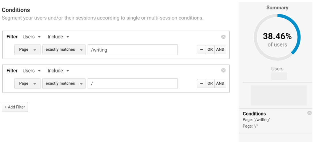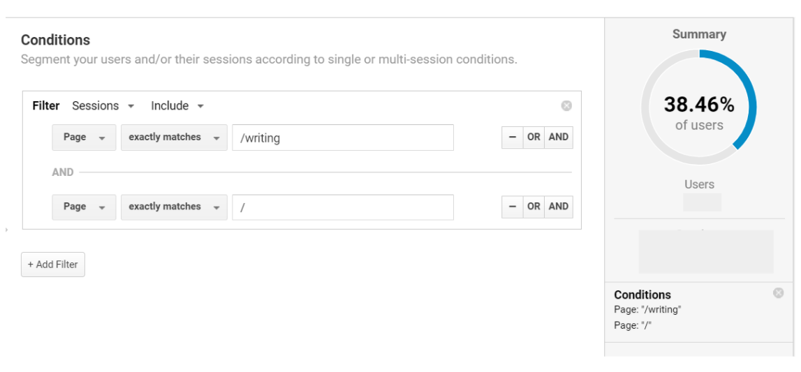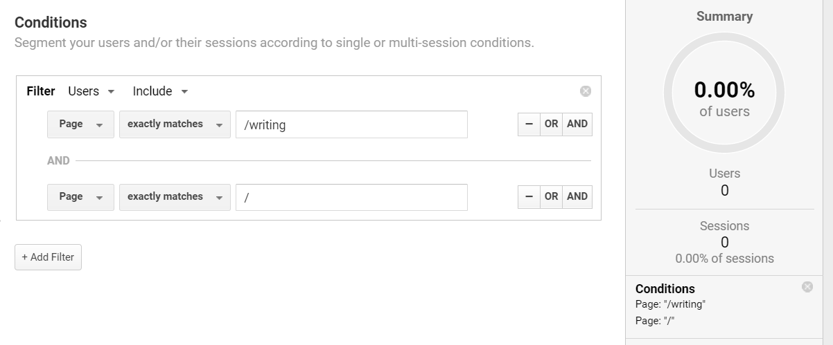 To take a working example, if I want to see how many sessions have included a visit to my homepage and to my blog, I can set up an advanced condition to cover this. I filter by sessions and include a condition for Page exactly matching the blog URL and Page exactly matching the homepage: