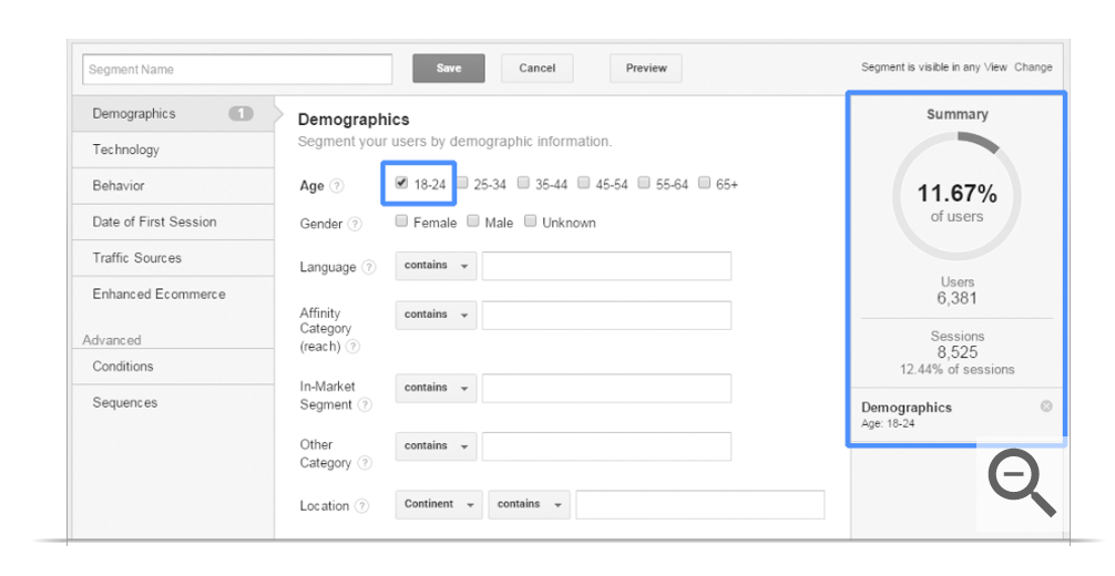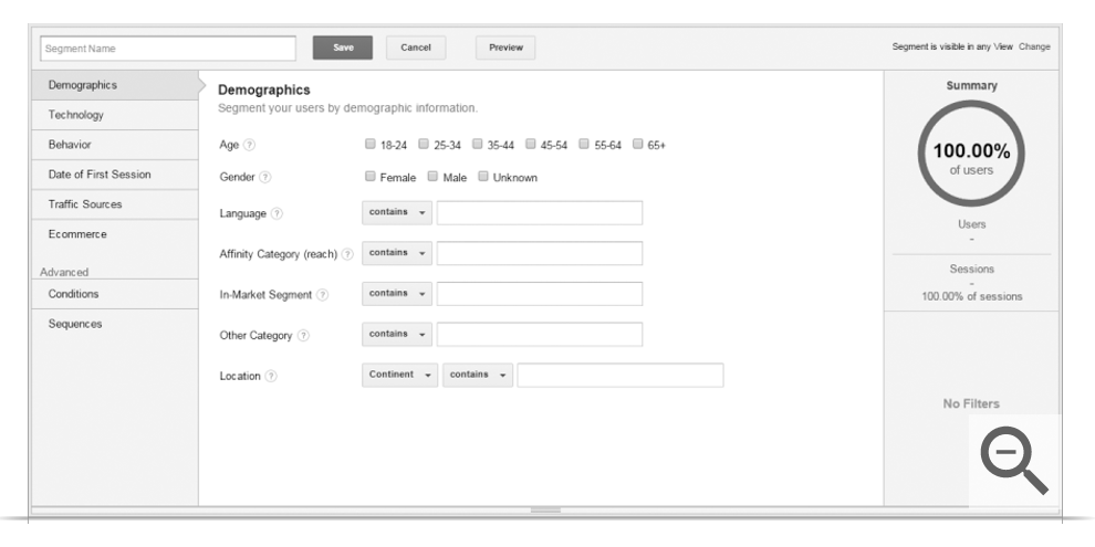 Google provides a very handy preview tool that shows us what percentage of our audience is included under the terms we are in the process of defining. This will always begin at 100% and decrease as our rules start to hone in on particular metrics and/or dimensions:
