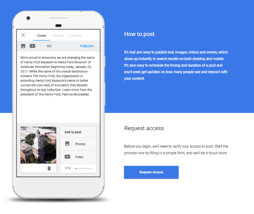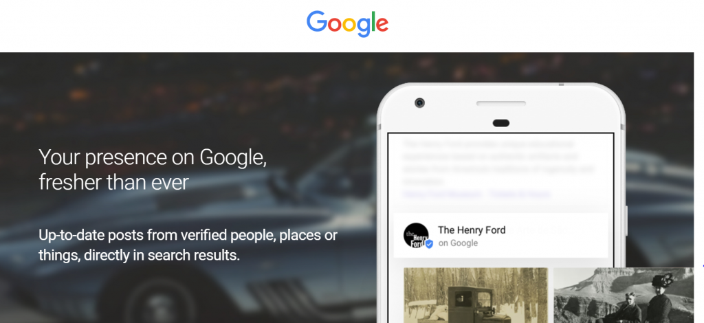 “Posting on Google is a new way to share relevant, fresh content with the people who are searching for you. Use image, videos and even animated GIFs to engage your audience, and ad inline links to drive traffic to specific content. This enhanced format allows searchers to hear directly from the primary source – you – and complements existing results from across the web.”