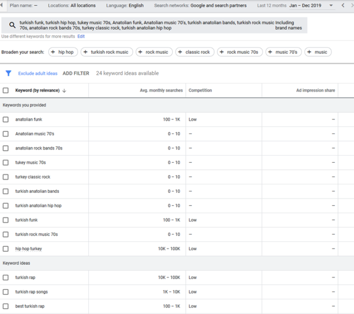 Now, not to be blasphemous. But I was never a fan of Keyword Planner. For example from the screenshot: I searched for “Turkish rap” and the data on searches it gives is “10K to 100K”? There’s a 90K difference in there that really matters.