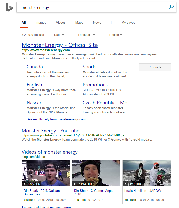 Search for Red Bull or Monster Energy or Vice in Bing. You are sure to get video results right at the top. That’s because these brands have focused their branding on video content, and hence are more likely to be popular as more and more people watch videos.