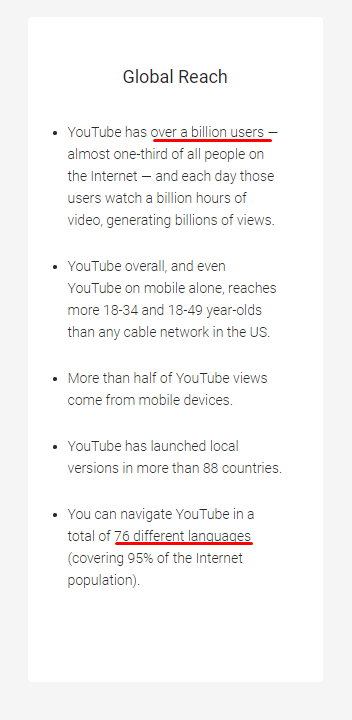 YouTube alone has over a billion users across continents consuming content in 76 different languages. Its reach is enormous.