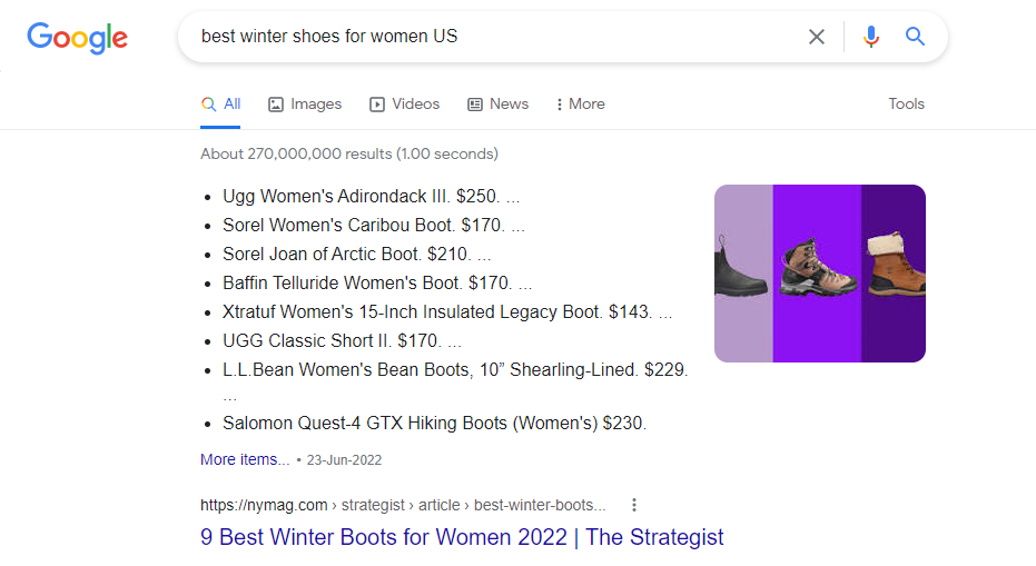 The phrase “best winter shoes for women US” may seem like a transactional keyword. But as it appears from the top search result, it has a dominant informational intent.
