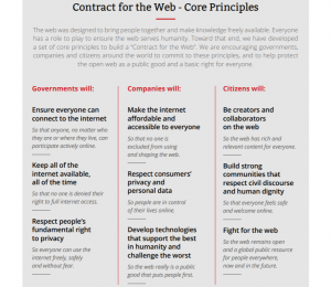 On the nearly sixty groups and individuals already signed up, Berners-Lee commented on the “richness” of the list — that we want everyone from large companies to groups of women in developing countries. “If we’re going to decide on the way we all together work towards having a web that has the right values,” he said, “we don’t want it to be a white guy’s contract, we want it to be a contract with everybody.”