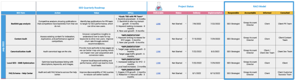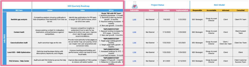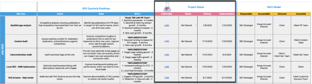 The sheet below is an example of an SEO quarterly roadmap. We define each project and quantify the impact on the business using relevant SEO KPIs and business terms (outlined in pink).