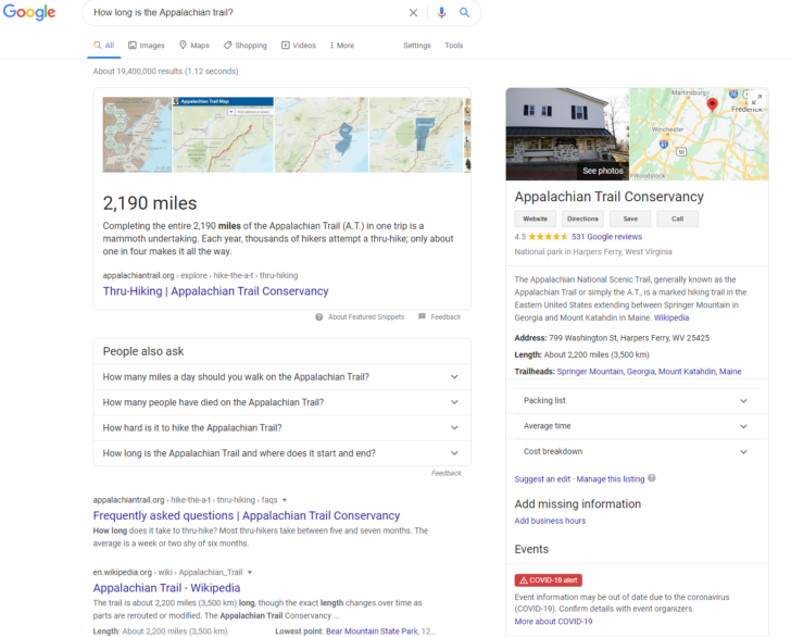 Let’s say you are working with a hiking shoe brand and throughout a keyword research you find terms surrounding the topic of the length of the Appalachian trail. When you perform a search for the query “How long is the Appalachian trail?”, the following will pop up: