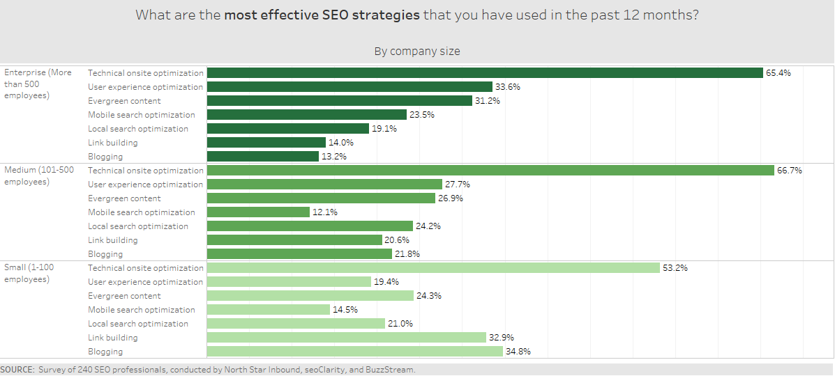 - While some SEO mainstays (like technical on-site SEO) are effective regardless of company size, the effectiveness of SEO strategies often depends on the size of a company, with smaller companies seeing much more success with strategies like blogging than larger organizations.