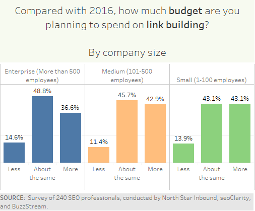 Large companies were most likely to be maintaining their link-building budgets, with 49% reporting they would be keeping their budget for link-building “about the same”, while small companies were most likely to be increasing their budget.