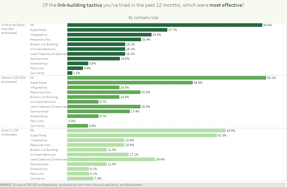 Other effective strategies included infographics (third-most effective for large companies of 500+ employees), local citations/directories (which came in third for small companies), and resource links (which ranked third for medium-sized companies, joint with local citations).