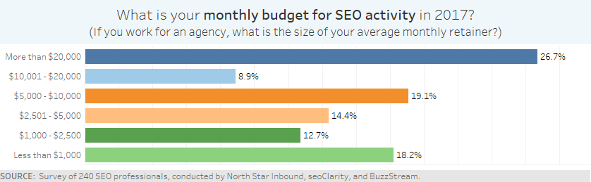 The good news (at least for SEOs!) is that the most popular budget was also the largest: 27% of respondents reported that they had a monthly budget of more than $20,000 for SEO. Close to a fifth of companies (19%) had between $5,000 and $10,000 to play with, while a very similar percentage (18%) were allocated less than $1,000.