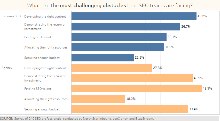 When it comes to organizational challenges, agency and in-house SEOs differ slightly on what they consider to be the most pressing issues. Agency SEOs are more likely to encounter challenges with finding SEO talent (44% reported this as their most challenging obstacle) or demonstrating ROI (41%).