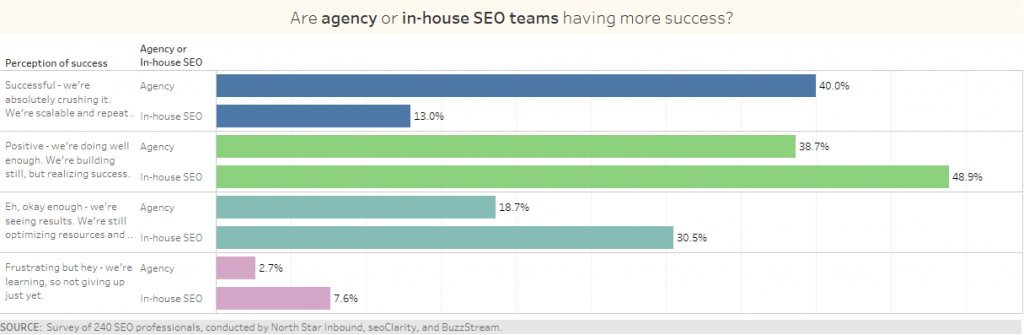 But the real differences came in the way that agency and in-house SEOs perceived their own success. Agency SEOs were vastly more likely to be confident about their own success: 40% of agency respondents rated themselves as “Successful – we’re absolutely crushing it” compared with just 13% of in-house SEO teams.