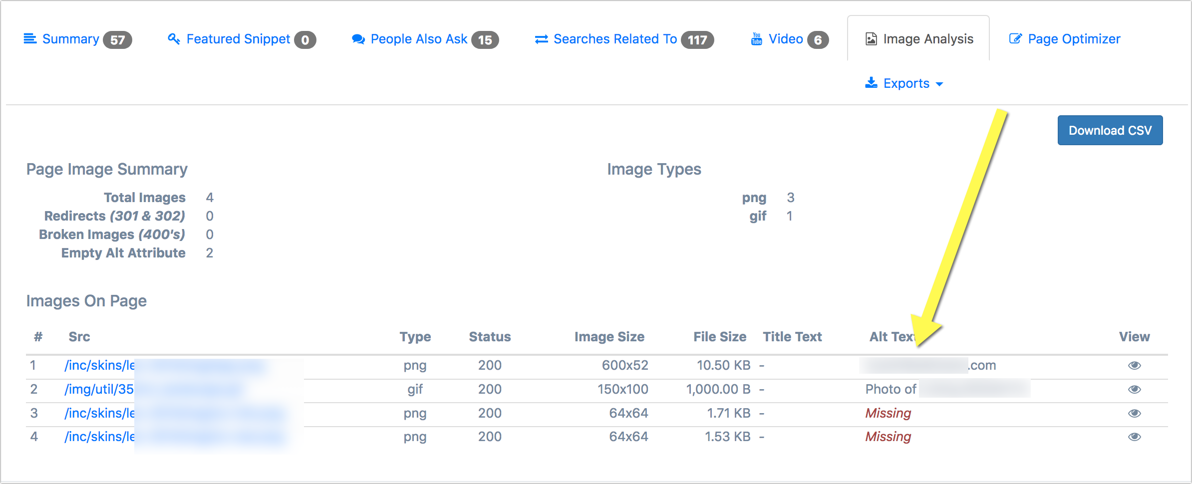 The featured snippet tool may be of help here showing you which images are missing an alt tag and which images show a meaningless alt tag, on-page by page basis: