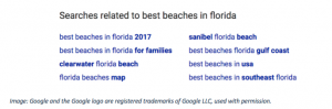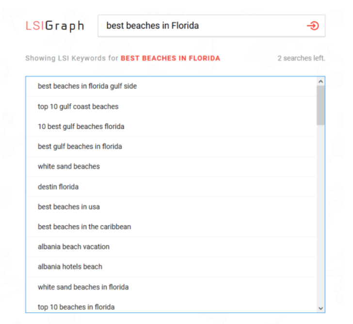 In determining your LSI keywords, you need to maintain an expansive view of your target keyword’s topic; do not simply plug in other words that mean more or less the same thing. For instance, a page targeting “best beaches in Florida” shouldn’t just utilize synonym-based LSI keywords like “best coast in Florida” and “best shore in Florida,” but should also use terms that describe the subject more conceptually, i.e. “Florida beach vacations,” or “Florida water getaways.”