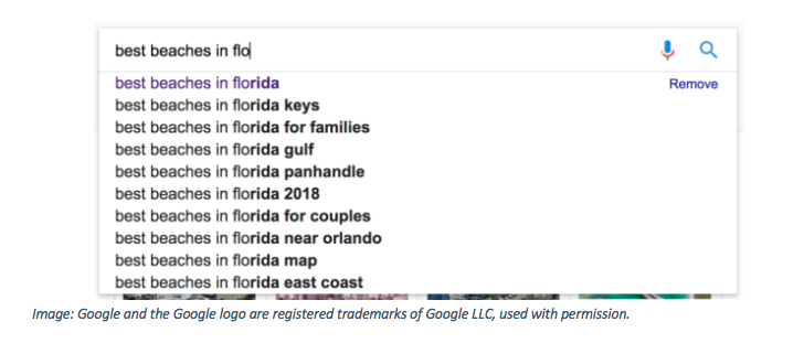 Another valuable keyword discovery strategy is to view the other strings that appear in Google’s search bar as you type in your target.