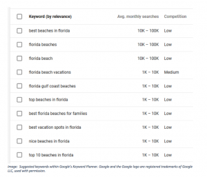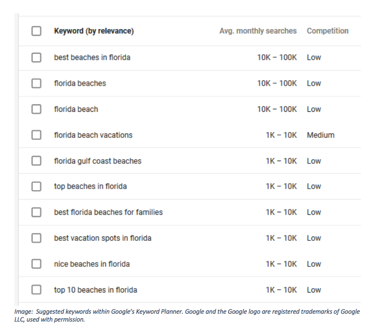 Image: Suggested keywords within Google’s Keyword Planner. Google and the Google logo are registered trademarks of Google LLC, used with permission.