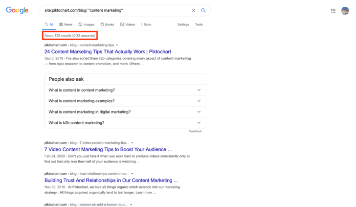 I can even include exact-match (“your keyword” in quotes) keywords to find out how much content Piktochart has published on any given topic, which is a clever way to uncover their topic cluster strategy.