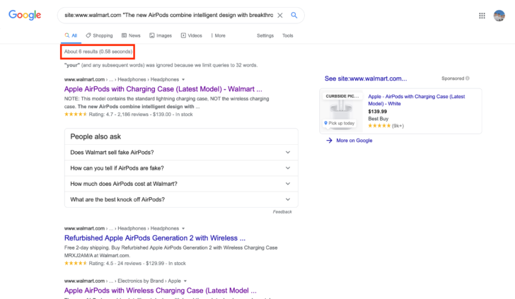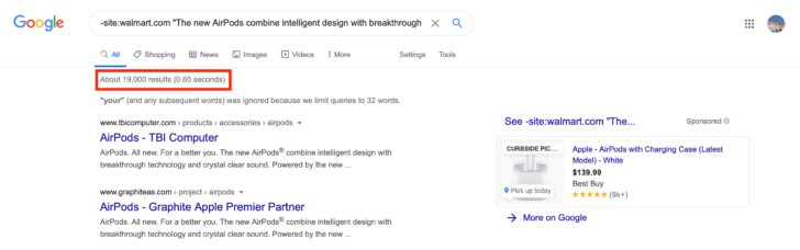 To show you an example of duplicate content, I’ll use this small piece of copy from the Apple Airpods product description on Walmart: