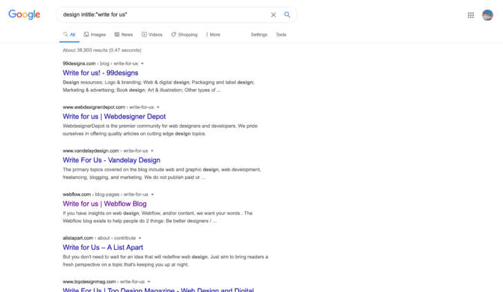 If I’m looking to guest post for sites in the design space, for example, I’d use the following query: