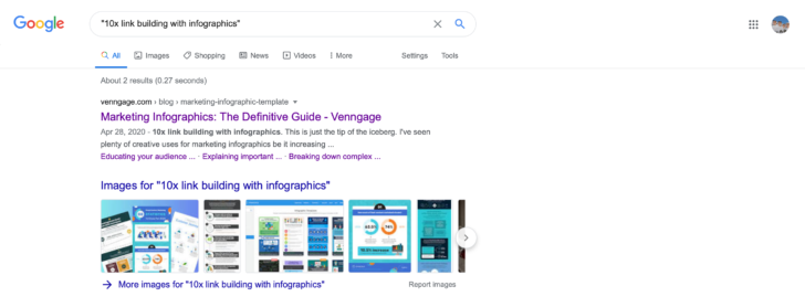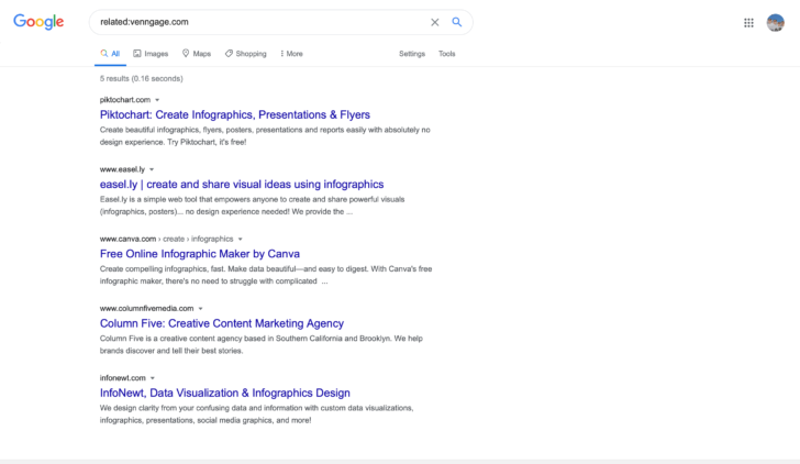 We’re an online infographic maker tool while both Column Five Media and InfoNewt appear to be done-for-you agencies. Google has identified and categorized them as sites related to Venngage which is an insightful find.