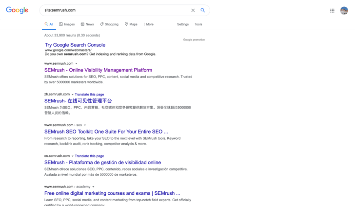 For example, If I enter site:semrush.com, I will only see results pertaining to SEMrush: