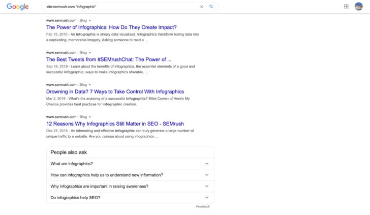 Let’s say I want to find whether we’ve covered the keyword “infographic” on the site. I’ll enter “site:semrush.com infographic” and this is what comes up: